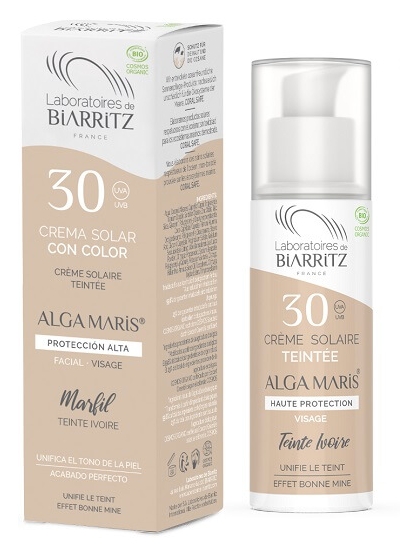 Nueva crema facial color Marfil con protección solar alta, SPF30, que protege de los rayos UVA/UVB mientras proporciona un tono bronceado a la piel. Con filtros minerales: Óxido de zinc y Dióxido de titanio. Además de un acabado y un tono perfecto, la nueva protección solar de Laboratoires de Biarritz, hidrata la piel y previene el envejecimiento. Apto para veganos. Textura no grasa. Perfume a vainilla.